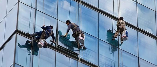 外墙清洗分为吊板方式和擦窗方式。吊板方式是用吊绳、吊板将人吊到工作位置进行清洗。这种型式比较简单,成本也低,只要工人身体素质好、绳子连接牢固就可以进行。